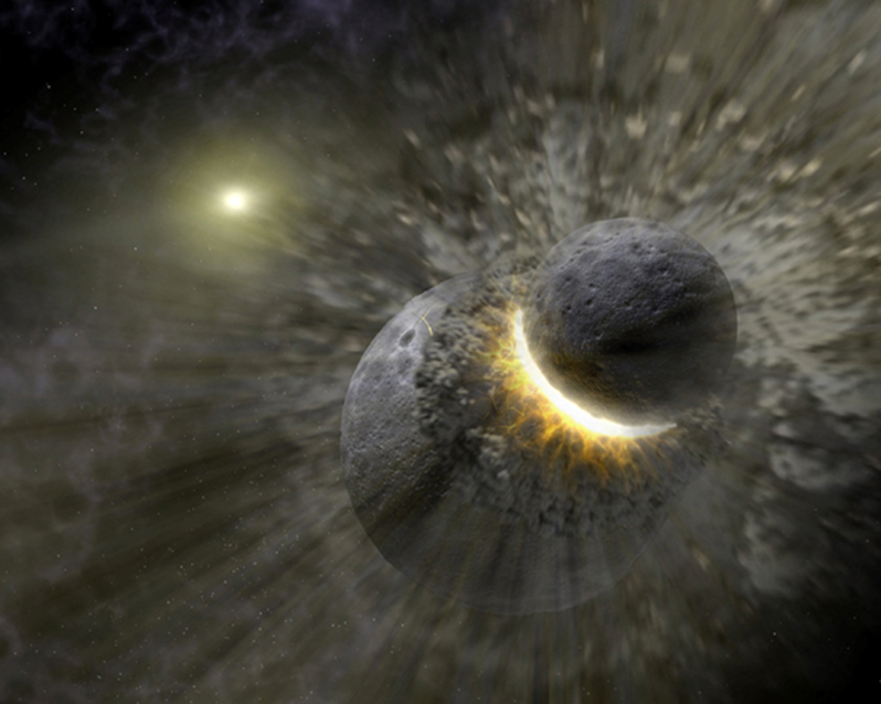 Hace aproximadamente 4.600 millones de años comenzó a colapsar material sobre sí mismo en la gran nube que formaba la nebulosa de nuestro sistema solar, generando un disco protoplanetario. Este disco se extendió 50 UA o más desde el centro del joven Sol (recordemos que la unidad astronómica es una unidad de medida -longitud- que se utiliza para las dimensiones típicas del Sistema Solar: 1 UA son 149.597.870.700 metros, aproximadamente 150 millones de kilómetros que es la distancia que separa a la Tierra del Sol).