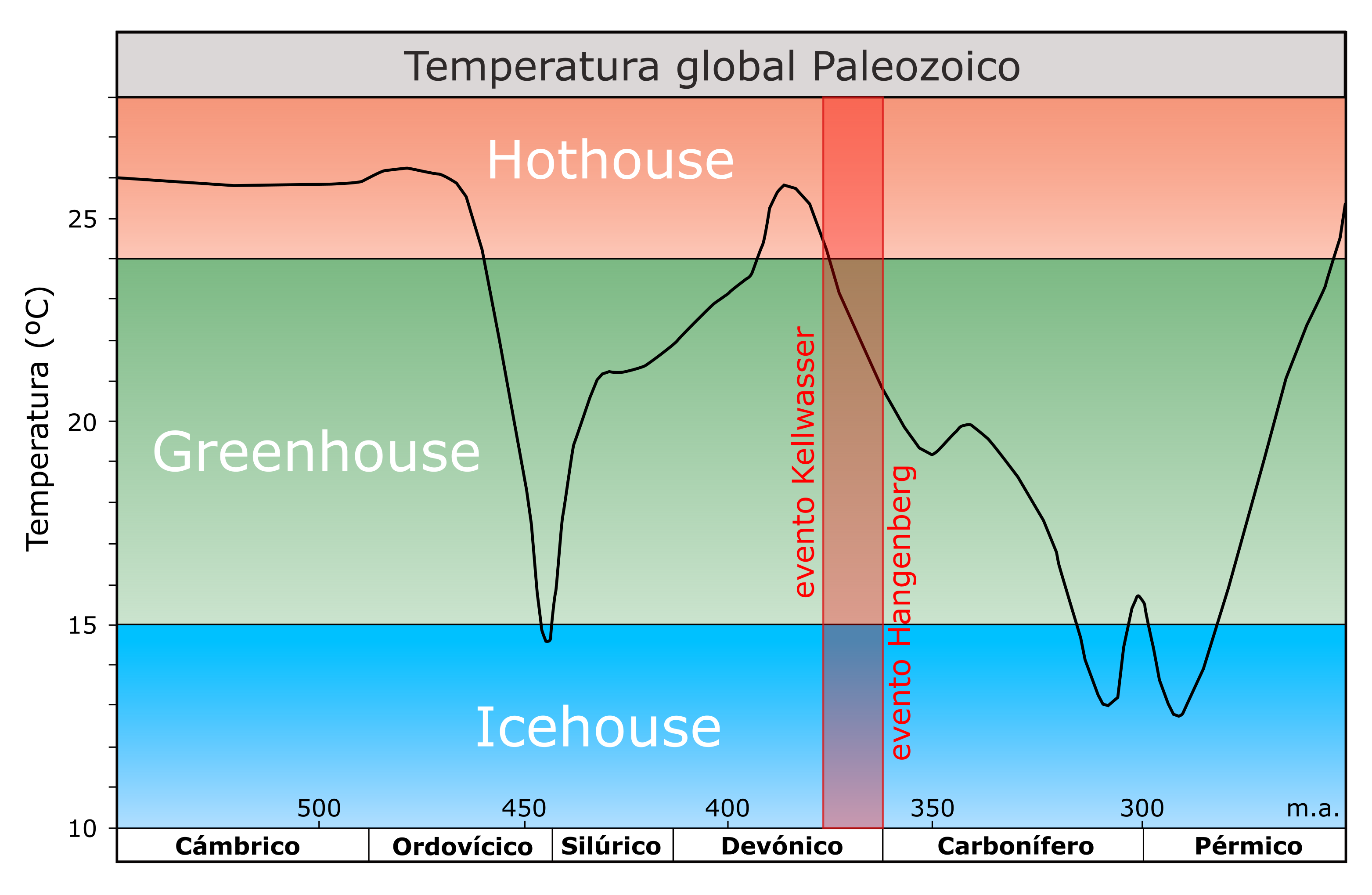25º decreciendo a 20º C en el transcurso del Devónico superior. Hothouse a Greenhouse