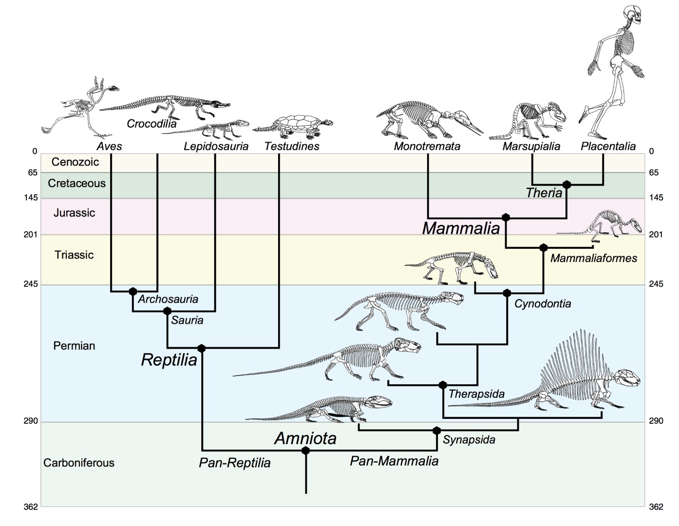 Los sinápsidos fueron, por tanto, los reptiles en los que se manifiestan las primeras evidencias hacia los mamíferos. Dentro de ellos, los terápsidos, de amplia distribución en el globo durante unos 80 Ma, fueron los antecesores directos de los mamíferos. A su vez, dentro de los terápsidos, los cinodontes (Cynodontia) (dentro de ellos un linaje de pequeños carnívoros) fueron los reptiles que más rasgos mamiferoides presentaban y, de hecho, se piensa que los mamíferos surgieron de un grupo de ellos.