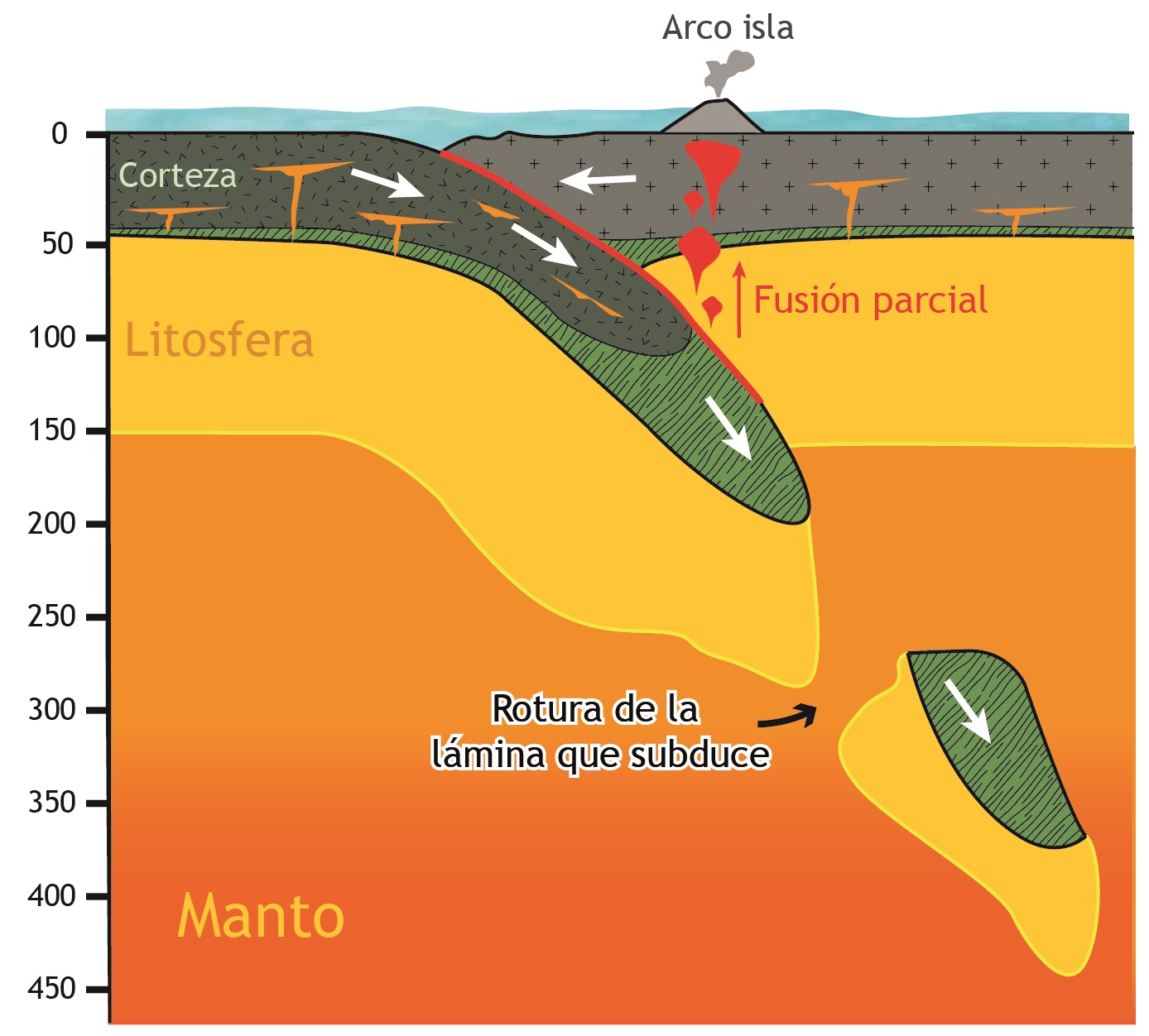 Esta tectónica primordial presentaba diferencias respecto a la actual, principalmente derivadas de una mayor temperatura del manto (respecto al actual) que condicionaba la naturaleza de la subducción primitiva. Se cree que estos primeros eventos de subducción serían episódicos, a pequeña escala y de corta duración. Su duración se estima en unos pocos millones de años, máximo 20. Durante estos episodios, la corteza que subducía se hundía y rompía rápidamente en el manto, desconectándose del resto de la placa y, por tanto, dejando de “tirar” de ella (Fig. 1b). En consecuencia, la subducción y la propia tectónica se ralentizarían o se detendrían durante ciertos periodos de tiempo, para, posteriormente, volverse a reiniciar el proceso. Este régimen dominó el planeta hasta hace aproximadamente unos 1000 millones de años. A medida que el manto se enfriaba, la escala y duración de estos eventos aumentaron, evolucionando hacia una subducción y una tectónica más constantes y parecidas a las actuales.