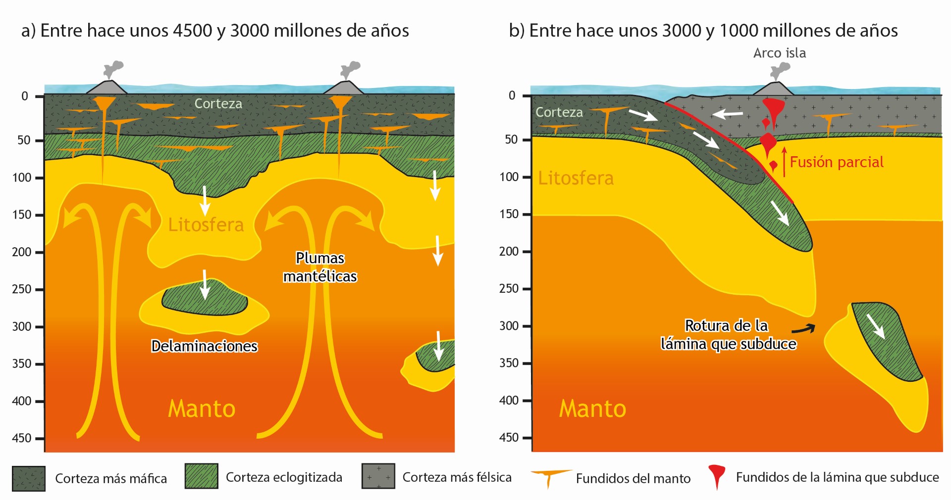 Durante el Hádico y principios del Arcaico, la Tierra se encontraba en las primeras etapas de su historia. Las todavía altas temperaturas del interior del planeta favorecían un estado en el que no existía la subducción ni, por lo tanto, la tectónica de placas. Bajo este régimen, la Tierra estaba caracterizada por una corteza fija y sin fragmentar que cubría, a modo de cáscara de huevo, un manto terrestre mucho más caliente que el actual (régimen stagnant-lid, en inglés) (Fig. 1a). Las altas temperaturas del manto, así como la composición y espesor de la corteza primitiva favorecían la “flotabilidad” de la misma debido a su menor densidad relativa. En aquel entonces, la dinámica interna terrestre estaba caracterizada por movimientos en la vertical, mayormente por plumas mantélicas y delaminaciones litosféricas (Fig. 1a).